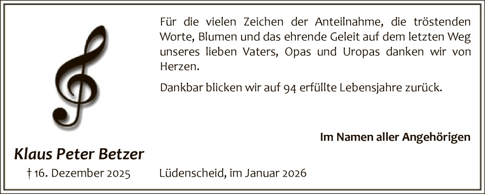 Hier finden Sie alle Traueranzeigen aus der Zeitung, die bisher für Klaus Peter Betzer erschienen sind. Weitere Traueranzeigen, die in der Zeitung erscheinen, werden hier ebenfalls aufgelistet