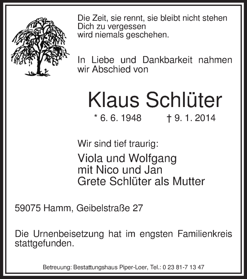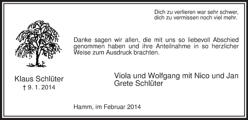 Hier finden Sie alle Traueranzeigen aus der Zeitung, die bisher für Klaus Schlüter erschienen sind. Weitere Traueranzeigen, die in der Zeitung erscheinen, werden hier ebenfalls aufgelistet
