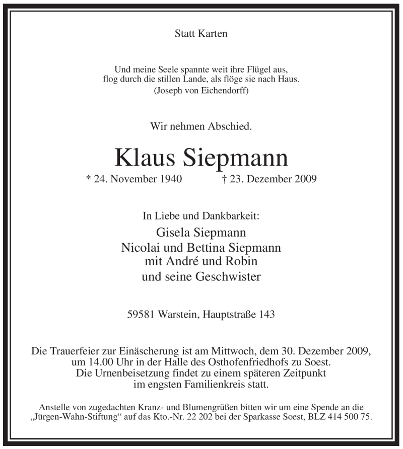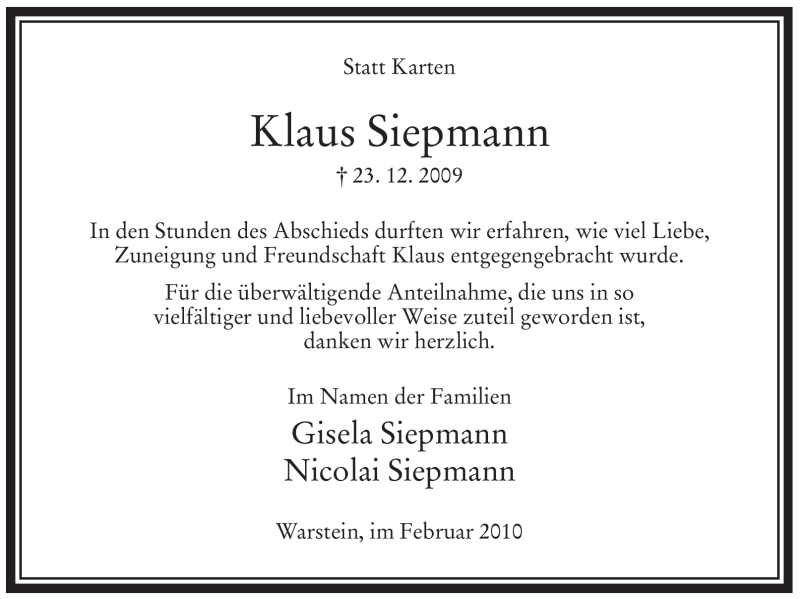 Hier finden Sie alle Traueranzeigen aus der Zeitung, die bisher für Klaus Siepmann erschienen sind. Weitere Traueranzeigen, die in der Zeitung erscheinen, werden hier ebenfalls aufgelistet