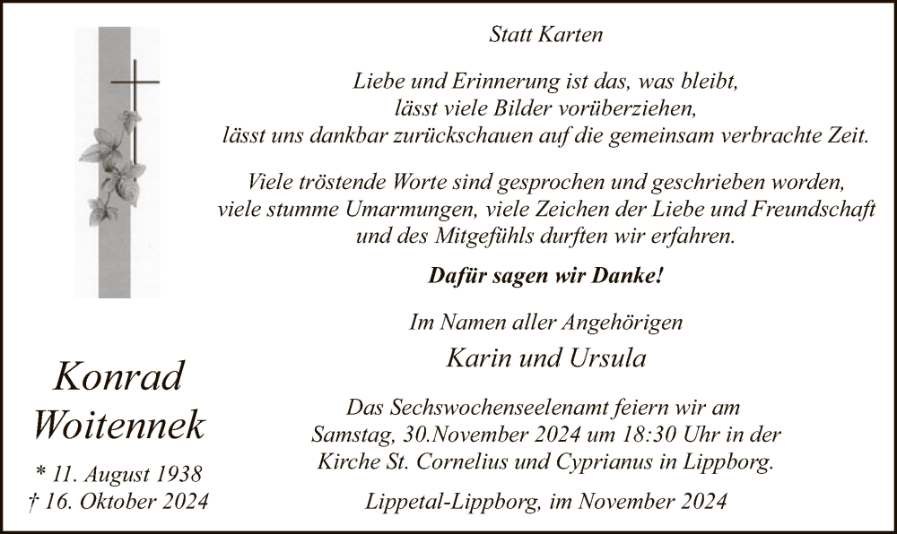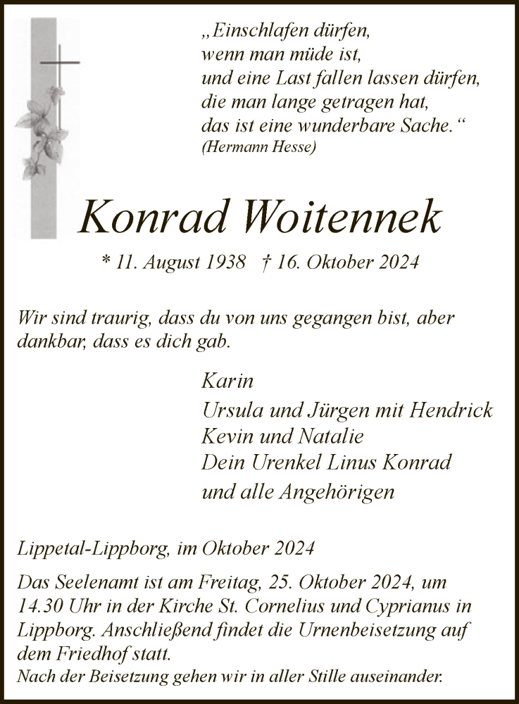 Hier finden Sie alle Traueranzeigen aus der Zeitung, die bisher für Konrad Woitennek erschienen sind. Weitere Traueranzeigen, die in der Zeitung erscheinen, werden hier ebenfalls aufgelistet
