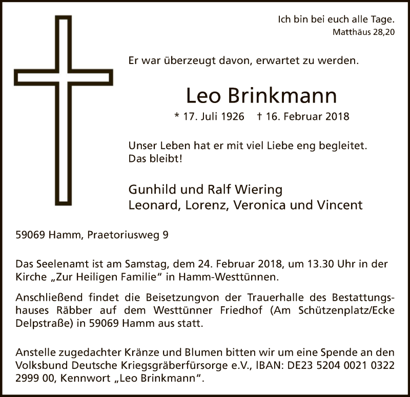 Hier finden Sie alle Traueranzeigen aus der Zeitung, die bisher für Leo Brinkmann erschienen sind. Weitere Traueranzeigen, die in der Zeitung erscheinen, werden hier ebenfalls aufgelistet
