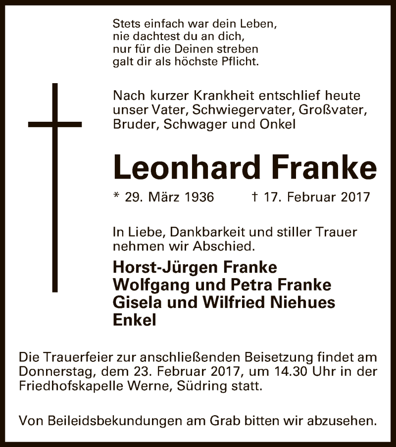 Hier finden Sie alle Traueranzeigen aus der Zeitung, die bisher für Leonhard Franke erschienen sind. Weitere Traueranzeigen, die in der Zeitung erscheinen, werden hier ebenfalls aufgelistet