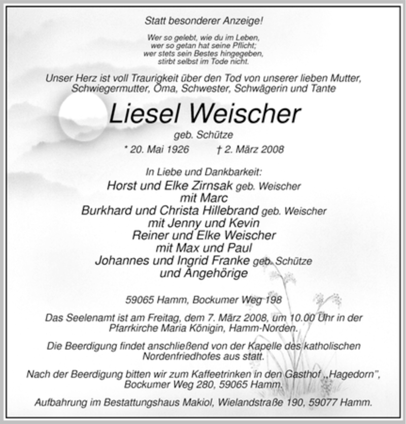Hier finden Sie alle Traueranzeigen aus der Zeitung, die bisher für Liesel Weischer erschienen sind. Weitere Traueranzeigen, die in der Zeitung erscheinen, werden hier ebenfalls aufgelistet