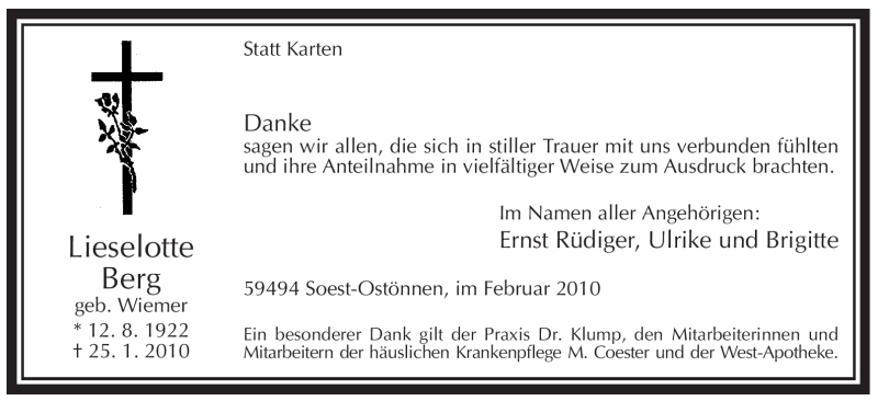 Hier finden Sie alle Traueranzeigen aus der Zeitung, die bisher für Lieselotte Berg erschienen sind. Weitere Traueranzeigen, die in der Zeitung erscheinen, werden hier ebenfalls aufgelistet