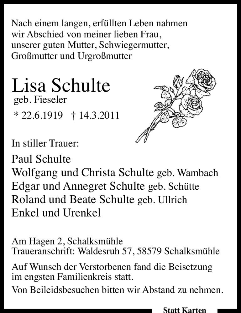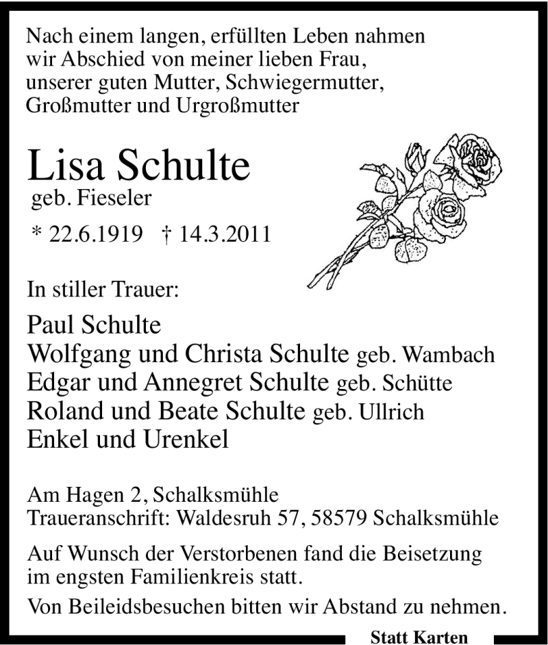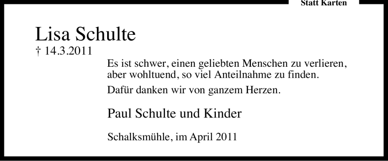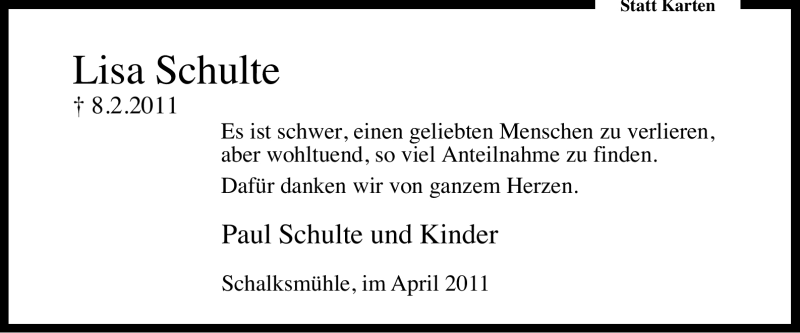 Hier finden Sie alle Traueranzeigen aus der Zeitung, die bisher für Lisa Schulte erschienen sind. Weitere Traueranzeigen, die in der Zeitung erscheinen, werden hier ebenfalls aufgelistet