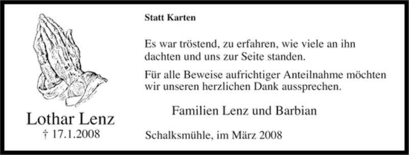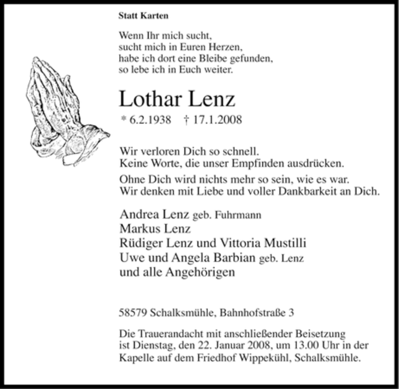 Hier finden Sie alle Traueranzeigen aus der Zeitung, die bisher für Lothar Lenz erschienen sind. Weitere Traueranzeigen, die in der Zeitung erscheinen, werden hier ebenfalls aufgelistet