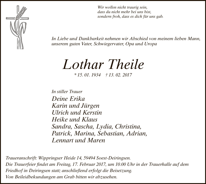 Hier finden Sie alle Traueranzeigen aus der Zeitung, die bisher für Lothar Theile erschienen sind. Weitere Traueranzeigen, die in der Zeitung erscheinen, werden hier ebenfalls aufgelistet