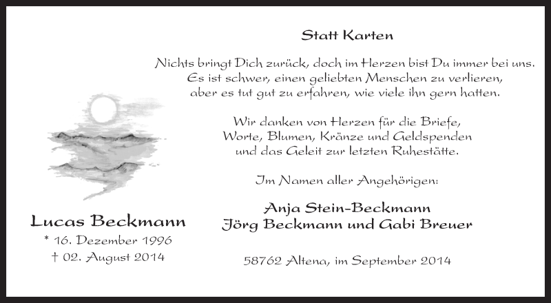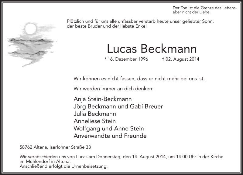 Hier finden Sie alle Traueranzeigen aus der Zeitung, die bisher für Lucas Beckmann erschienen sind. Weitere Traueranzeigen, die in der Zeitung erscheinen, werden hier ebenfalls aufgelistet