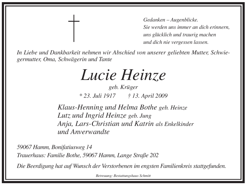 Hier finden Sie alle Traueranzeigen aus der Zeitung, die bisher für Lucie Heinze erschienen sind. Weitere Traueranzeigen, die in der Zeitung erscheinen, werden hier ebenfalls aufgelistet