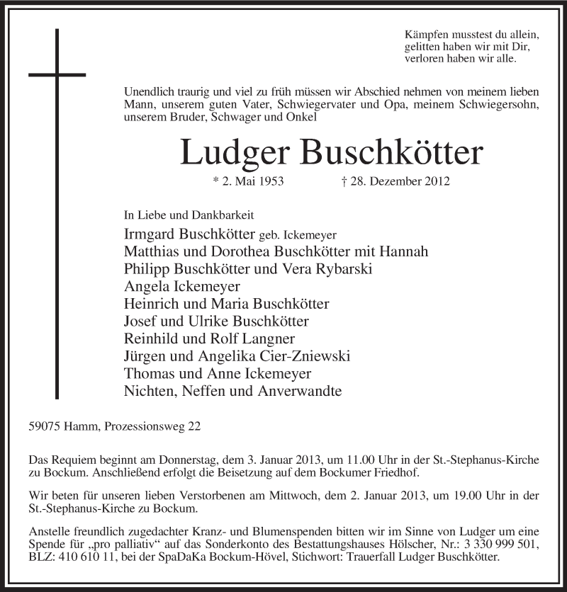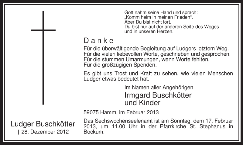 Hier finden Sie alle Traueranzeigen aus der Zeitung, die bisher für Ludger Buschkötter erschienen sind. Weitere Traueranzeigen, die in der Zeitung erscheinen, werden hier ebenfalls aufgelistet