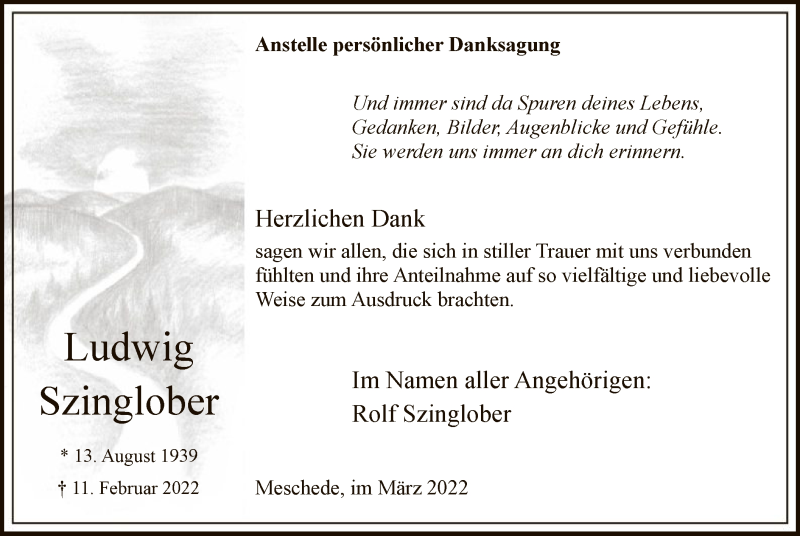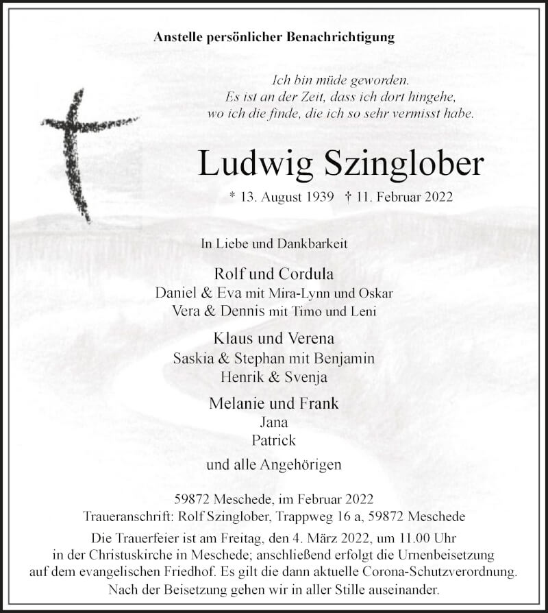 Hier finden Sie alle Traueranzeigen aus der Zeitung, die bisher für Ludwig Szinglober erschienen sind. Weitere Traueranzeigen, die in der Zeitung erscheinen, werden hier ebenfalls aufgelistet