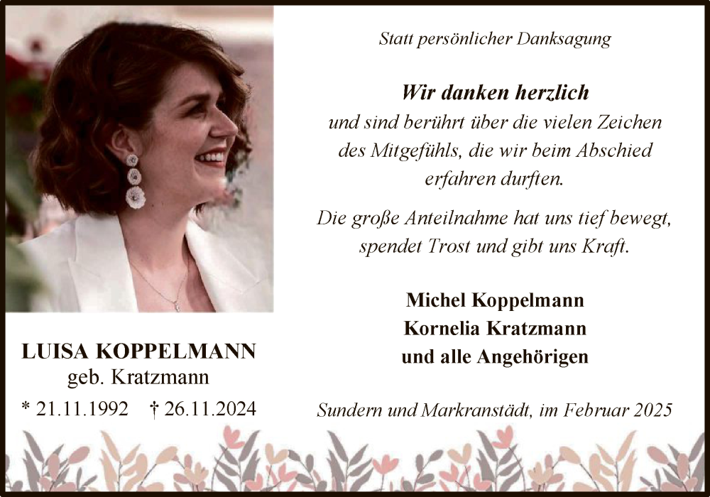 Hier finden Sie alle Traueranzeigen aus der Zeitung, die bisher für Luisa Koppelmann erschienen sind. Weitere Traueranzeigen, die in der Zeitung erscheinen, werden hier ebenfalls aufgelistet
