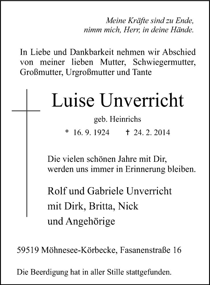 Hier finden Sie alle Traueranzeigen aus der Zeitung, die bisher für Luise Unverricht erschienen sind. Weitere Traueranzeigen, die in der Zeitung erscheinen, werden hier ebenfalls aufgelistet