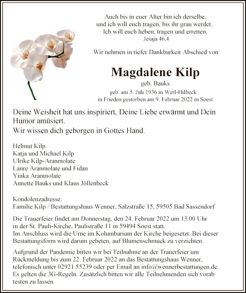 Hier finden Sie alle Traueranzeigen aus der Zeitung, die bisher für Magdalene Kilp erschienen sind. Weitere Traueranzeigen, die in der Zeitung erscheinen, werden hier ebenfalls aufgelistet