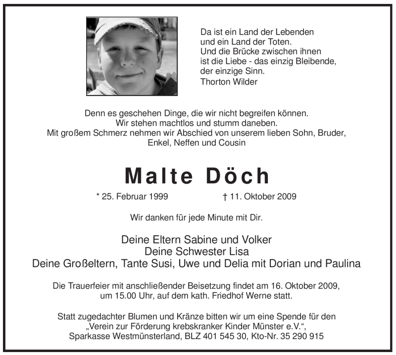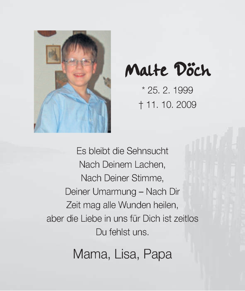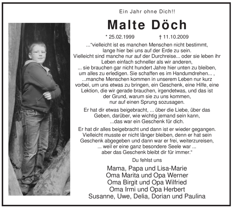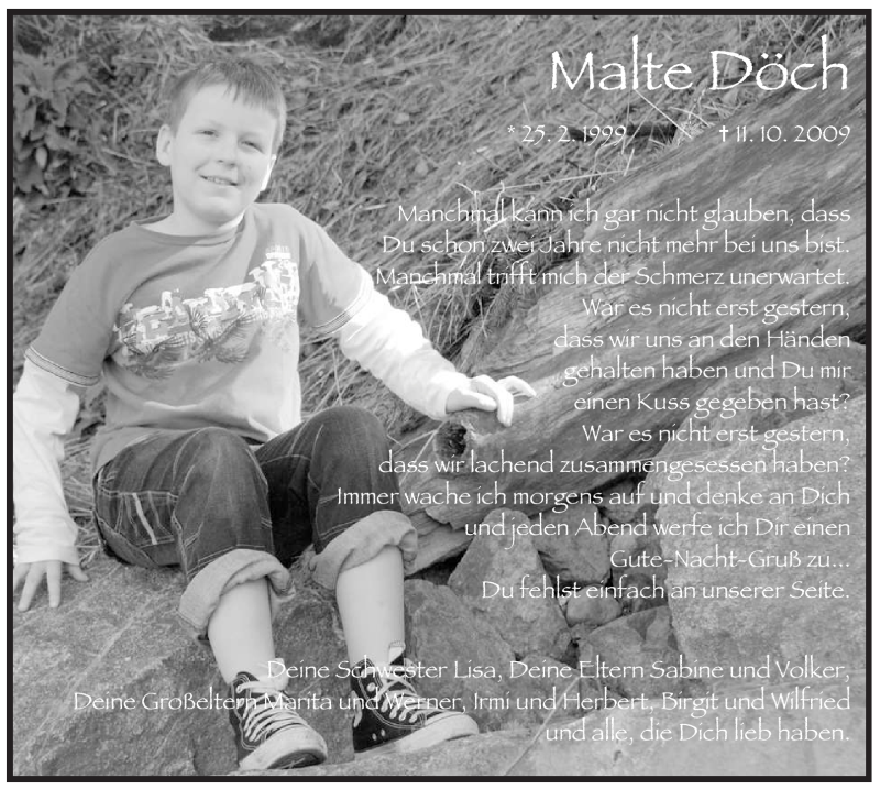 Hier finden Sie alle Traueranzeigen aus der Zeitung, die bisher für Malte Döch erschienen sind. Weitere Traueranzeigen, die in der Zeitung erscheinen, werden hier ebenfalls aufgelistet