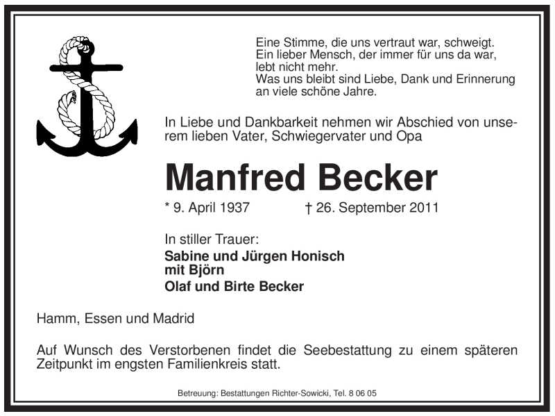 Hier finden Sie alle Traueranzeigen aus der Zeitung, die bisher für Manfred Becker erschienen sind. Weitere Traueranzeigen, die in der Zeitung erscheinen, werden hier ebenfalls aufgelistet