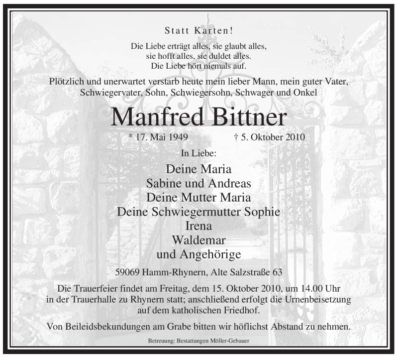 Hier finden Sie alle Traueranzeigen aus der Zeitung, die bisher für Manfred Bittner erschienen sind. Weitere Traueranzeigen, die in der Zeitung erscheinen, werden hier ebenfalls aufgelistet