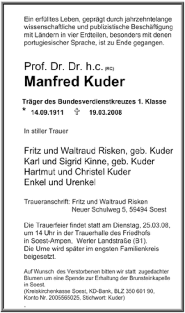 Hier finden Sie alle Traueranzeigen aus der Zeitung, die bisher für Manfred Kuder erschienen sind. Weitere Traueranzeigen, die in der Zeitung erscheinen, werden hier ebenfalls aufgelistet