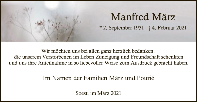 Hier finden Sie alle Traueranzeigen aus der Zeitung, die bisher für Manfred März erschienen sind. Weitere Traueranzeigen, die in der Zeitung erscheinen, werden hier ebenfalls aufgelistet