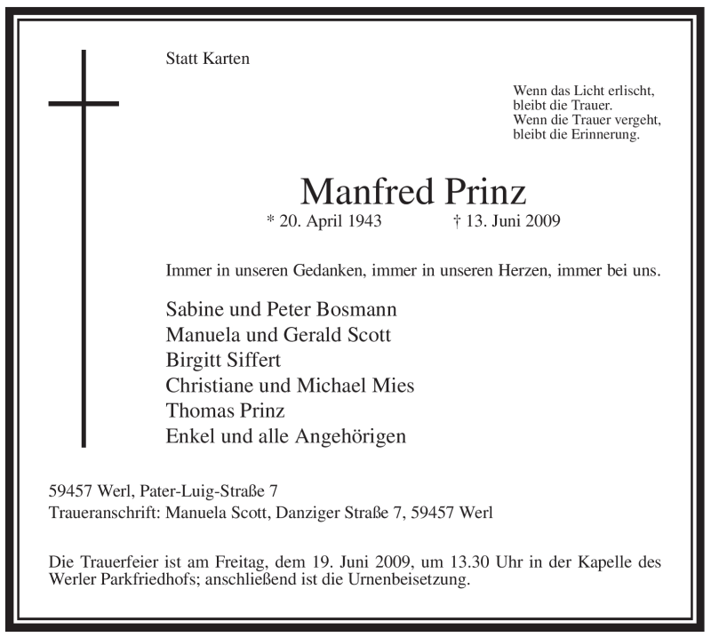 Hier finden Sie alle Traueranzeigen aus der Zeitung, die bisher für Manfred Prinz erschienen sind. Weitere Traueranzeigen, die in der Zeitung erscheinen, werden hier ebenfalls aufgelistet