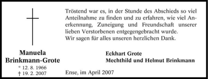 Hier finden Sie alle Traueranzeigen aus der Zeitung, die bisher für Manuela Brinkmann-Grote erschienen sind. Weitere Traueranzeigen, die in der Zeitung erscheinen, werden hier ebenfalls aufgelistet
