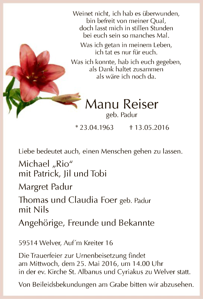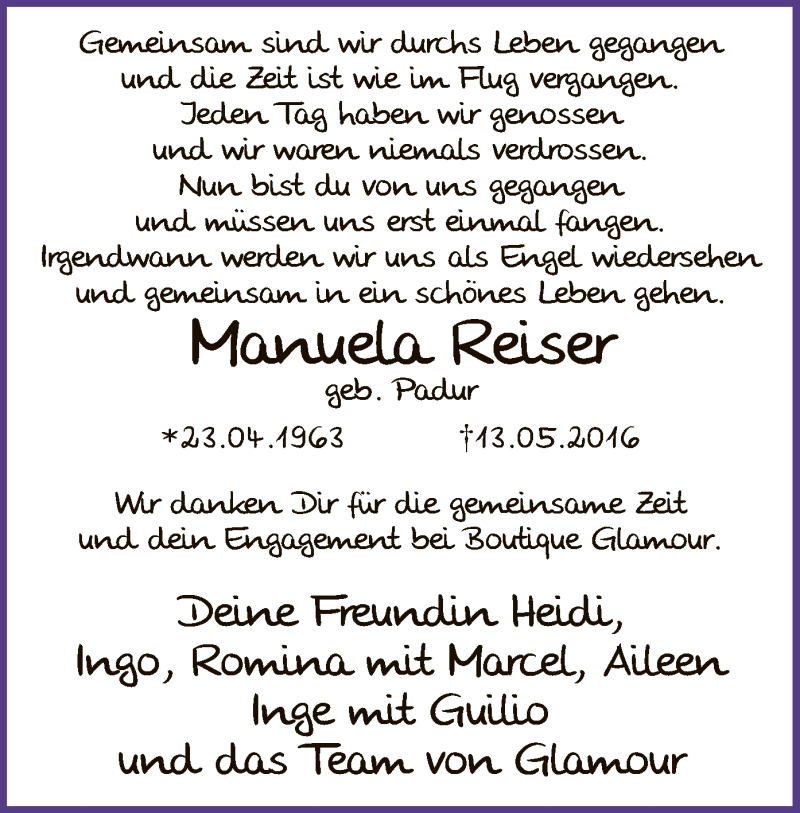 Hier finden Sie alle Traueranzeigen aus der Zeitung, die bisher für Manuela Reiser erschienen sind. Weitere Traueranzeigen, die in der Zeitung erscheinen, werden hier ebenfalls aufgelistet