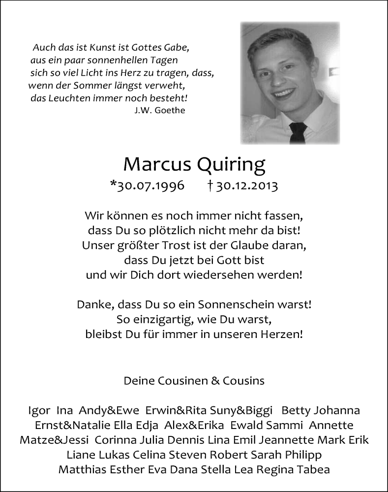 Hier finden Sie alle Traueranzeigen aus der Zeitung, die bisher für Marcus Quiring erschienen sind. Weitere Traueranzeigen, die in der Zeitung erscheinen, werden hier ebenfalls aufgelistet