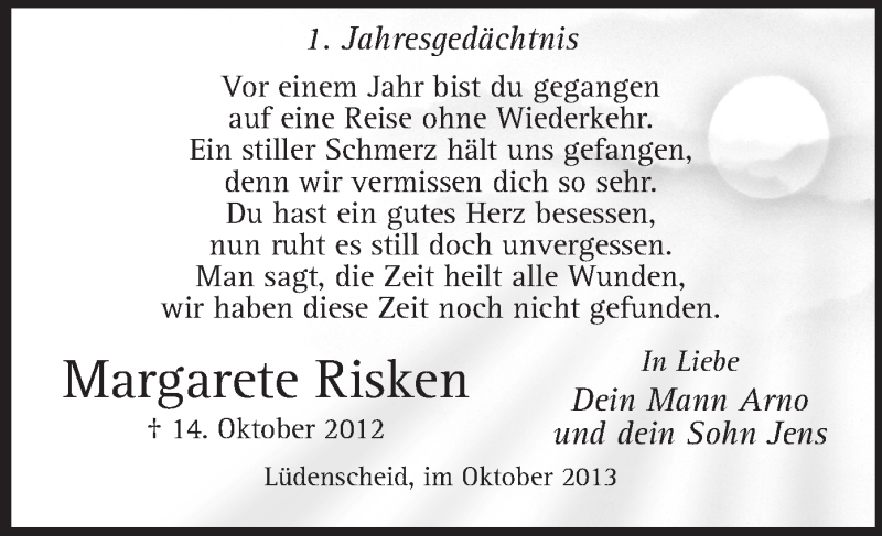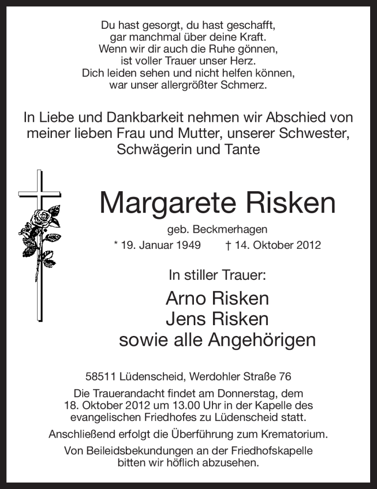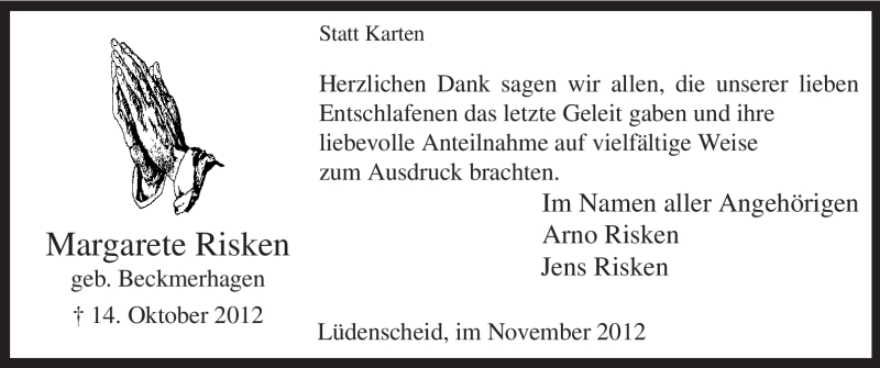 Hier finden Sie alle Traueranzeigen aus der Zeitung, die bisher für Margarete Risken erschienen sind. Weitere Traueranzeigen, die in der Zeitung erscheinen, werden hier ebenfalls aufgelistet