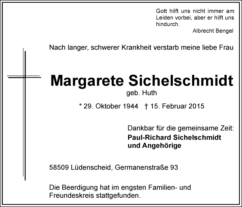 Hier finden Sie alle Traueranzeigen aus der Zeitung, die bisher für Margarete Sichelschmidt erschienen sind. Weitere Traueranzeigen, die in der Zeitung erscheinen, werden hier ebenfalls aufgelistet