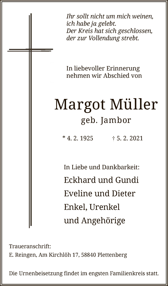 Hier finden Sie alle Traueranzeigen aus der Zeitung, die bisher für Margot Müller erschienen sind. Weitere Traueranzeigen, die in der Zeitung erscheinen, werden hier ebenfalls aufgelistet