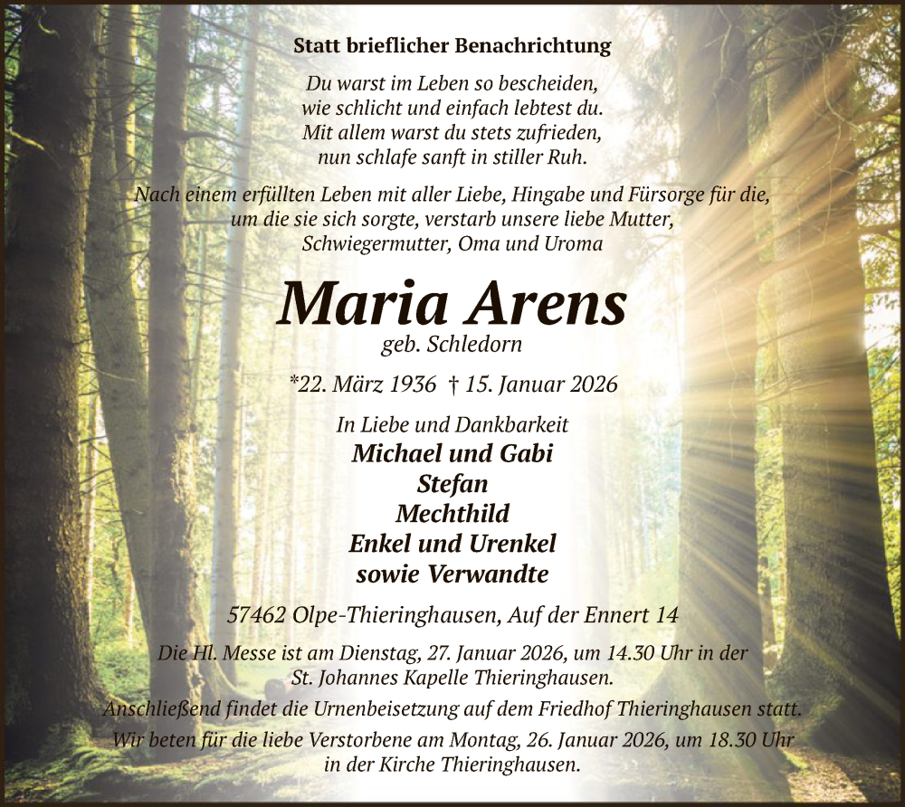 Hier finden Sie alle Traueranzeigen aus der Zeitung, die bisher für Maria Arens erschienen sind. Weitere Traueranzeigen, die in der Zeitung erscheinen, werden hier ebenfalls aufgelistet