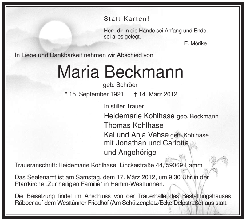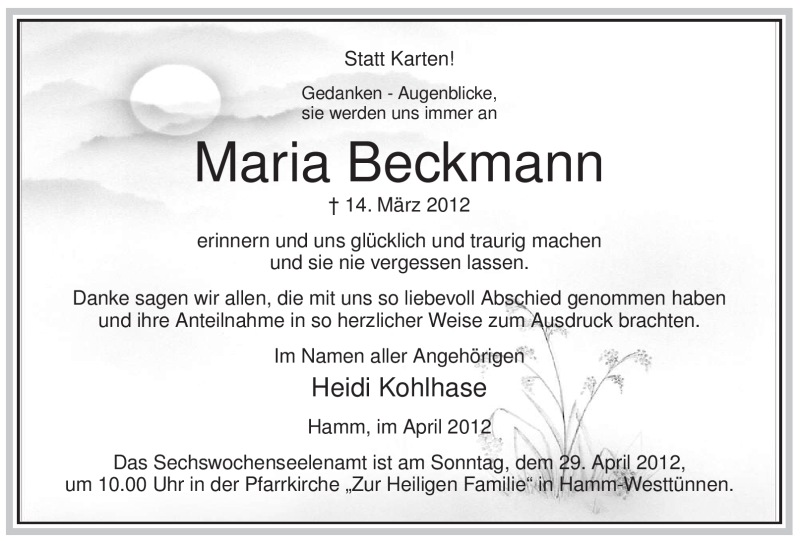 Hier finden Sie alle Traueranzeigen aus der Zeitung, die bisher für Maria Beckmann erschienen sind. Weitere Traueranzeigen, die in der Zeitung erscheinen, werden hier ebenfalls aufgelistet