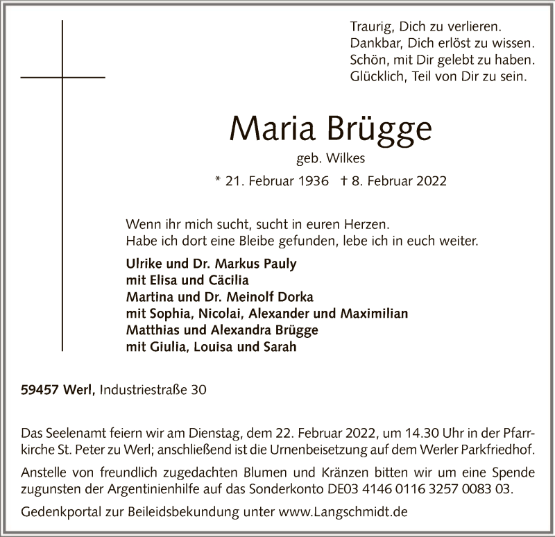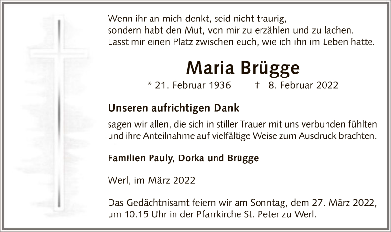 Hier finden Sie alle Traueranzeigen aus der Zeitung, die bisher für Maria Brügge erschienen sind. Weitere Traueranzeigen, die in der Zeitung erscheinen, werden hier ebenfalls aufgelistet