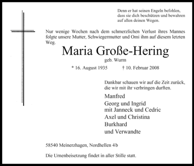 Hier finden Sie alle Traueranzeigen aus der Zeitung, die bisher für Maria Große-Hering erschienen sind. Weitere Traueranzeigen, die in der Zeitung erscheinen, werden hier ebenfalls aufgelistet