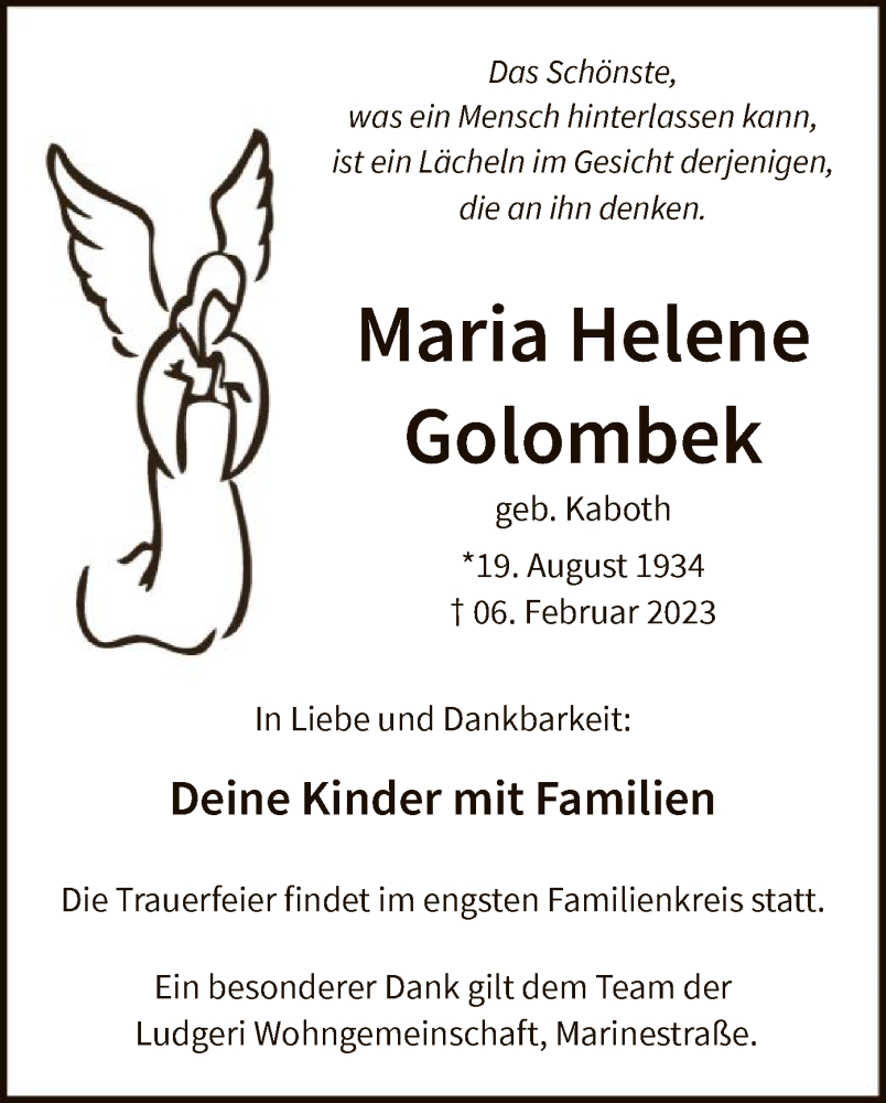 Hier finden Sie alle Traueranzeigen aus der Zeitung, die bisher für Maria Helene Golombek erschienen sind. Weitere Traueranzeigen, die in der Zeitung erscheinen, werden hier ebenfalls aufgelistet