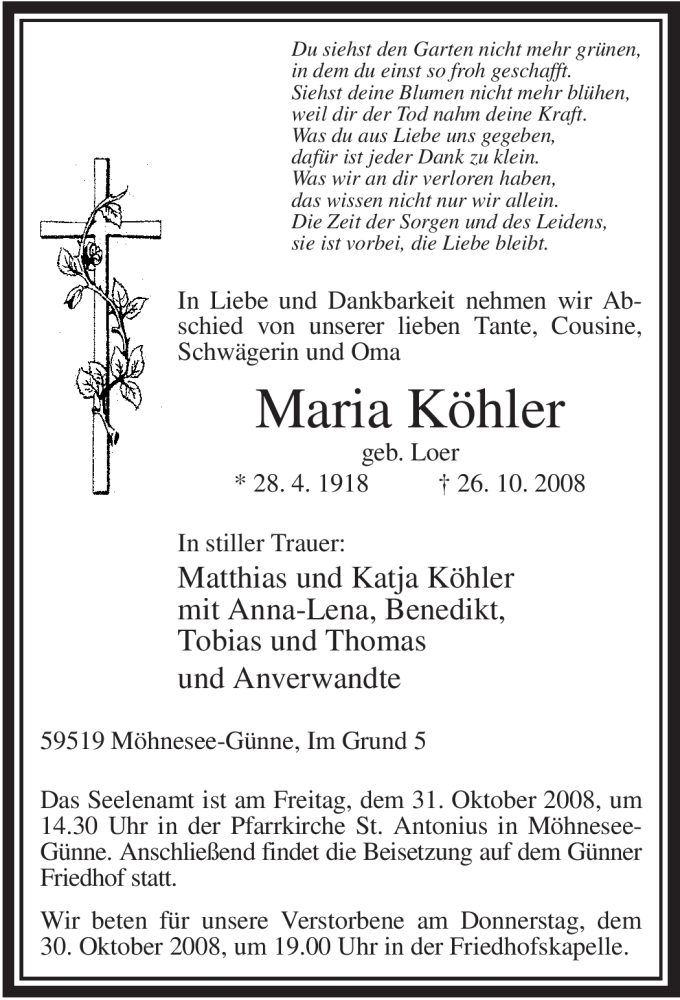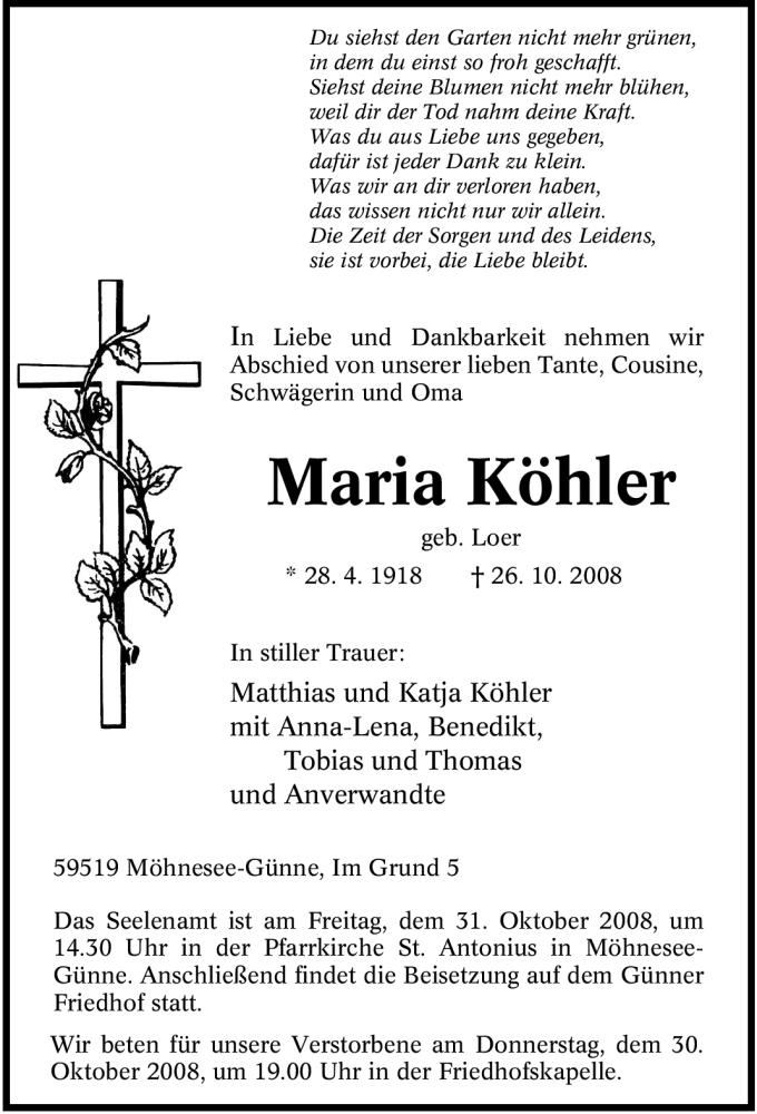 Hier finden Sie alle Traueranzeigen aus der Zeitung, die bisher für Maria Köhler erschienen sind. Weitere Traueranzeigen, die in der Zeitung erscheinen, werden hier ebenfalls aufgelistet