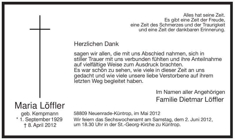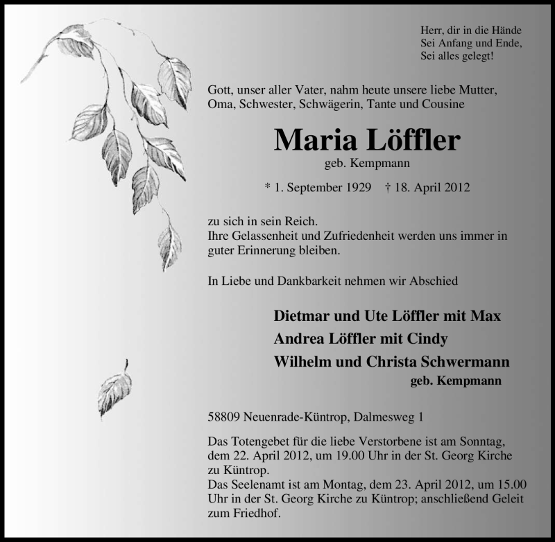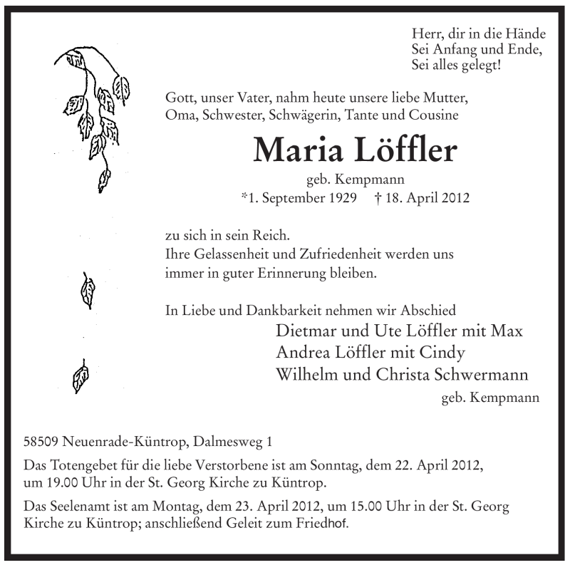 Hier finden Sie alle Traueranzeigen aus der Zeitung, die bisher für Maria Löffler erschienen sind. Weitere Traueranzeigen, die in der Zeitung erscheinen, werden hier ebenfalls aufgelistet