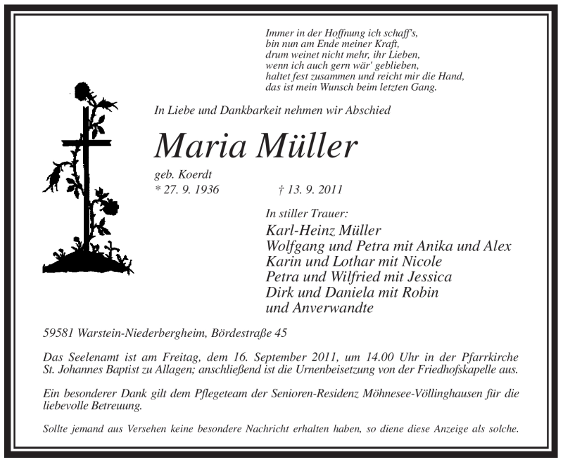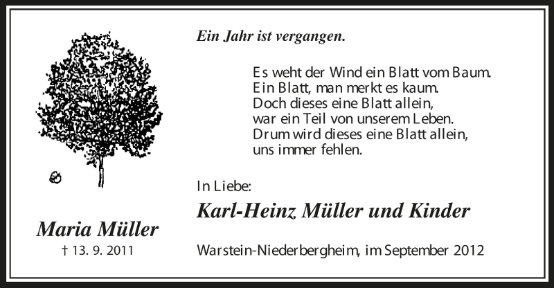 Hier finden Sie alle Traueranzeigen aus der Zeitung, die bisher für Maria Müller erschienen sind. Weitere Traueranzeigen, die in der Zeitung erscheinen, werden hier ebenfalls aufgelistet