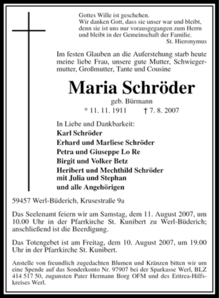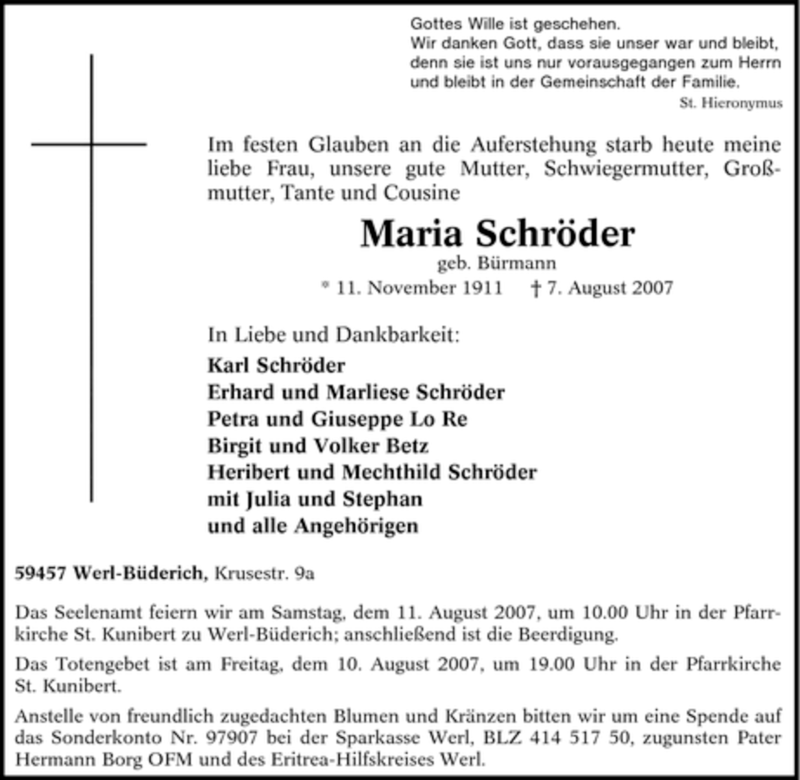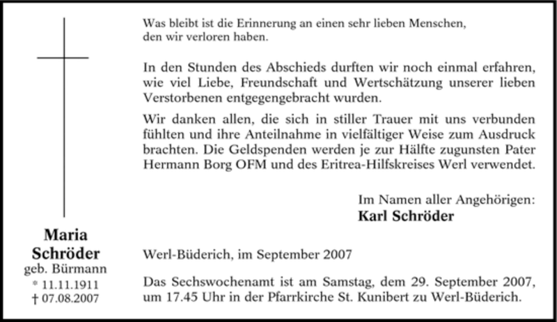 Hier finden Sie alle Traueranzeigen aus der Zeitung, die bisher für Maria Schröder erschienen sind. Weitere Traueranzeigen, die in der Zeitung erscheinen, werden hier ebenfalls aufgelistet