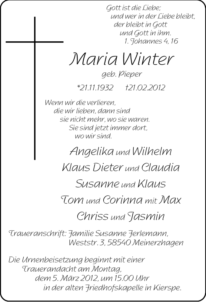 Hier finden Sie alle Traueranzeigen aus der Zeitung, die bisher für Maria Winter erschienen sind. Weitere Traueranzeigen, die in der Zeitung erscheinen, werden hier ebenfalls aufgelistet