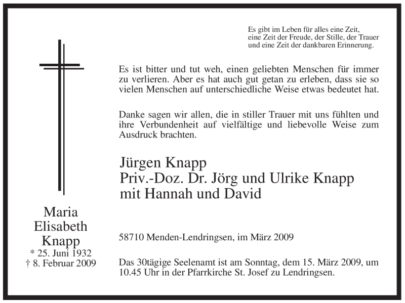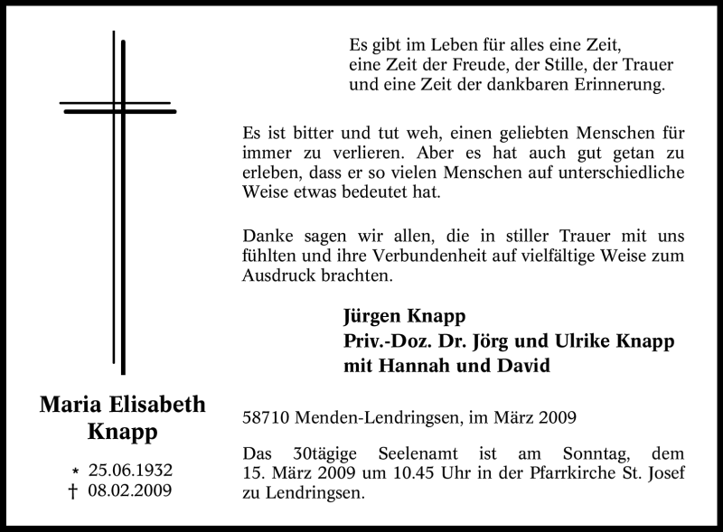 Hier finden Sie alle Traueranzeigen aus der Zeitung, die bisher für Maria Elisabeth Knapp erschienen sind. Weitere Traueranzeigen, die in der Zeitung erscheinen, werden hier ebenfalls aufgelistet