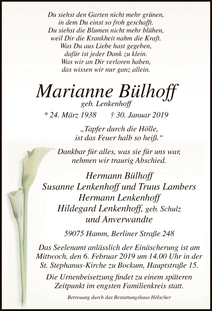 Hier finden Sie alle Traueranzeigen aus der Zeitung, die bisher für Marianne Bülhoff erschienen sind. Weitere Traueranzeigen, die in der Zeitung erscheinen, werden hier ebenfalls aufgelistet