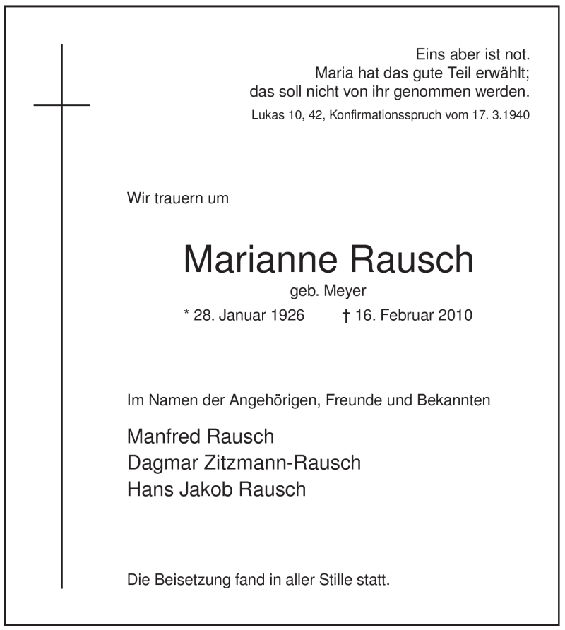 Hier finden Sie alle Traueranzeigen aus der Zeitung, die bisher für Marianne Rausch erschienen sind. Weitere Traueranzeigen, die in der Zeitung erscheinen, werden hier ebenfalls aufgelistet