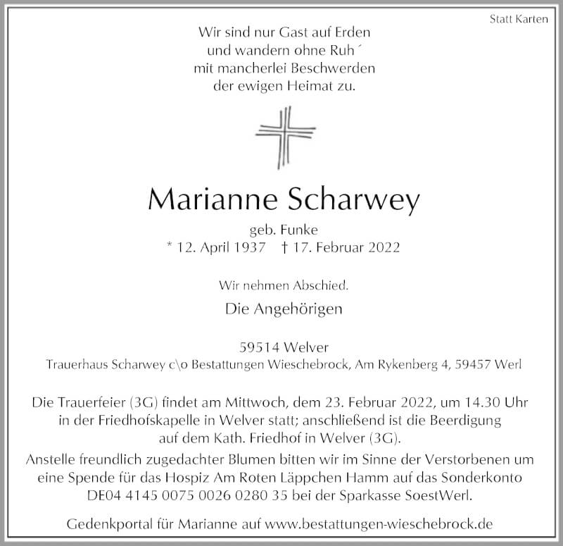 Hier finden Sie alle Traueranzeigen aus der Zeitung, die bisher für Marianne Scharwey erschienen sind. Weitere Traueranzeigen, die in der Zeitung erscheinen, werden hier ebenfalls aufgelistet
