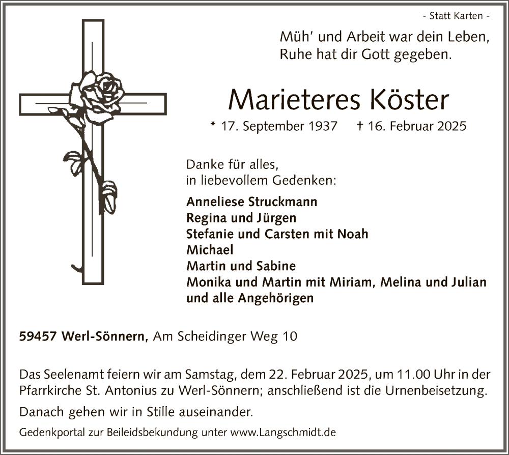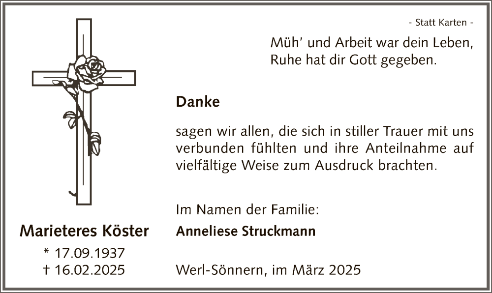Hier finden Sie alle Traueranzeigen aus der Zeitung, die bisher für Marieteres Köster erschienen sind. Weitere Traueranzeigen, die in der Zeitung erscheinen, werden hier ebenfalls aufgelistet