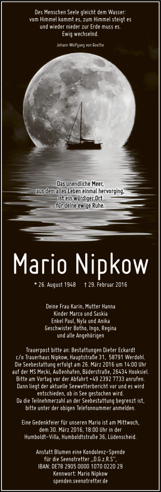 Hier finden Sie alle Traueranzeigen aus der Zeitung, die bisher für Mario Nipkow erschienen sind. Weitere Traueranzeigen, die in der Zeitung erscheinen, werden hier ebenfalls aufgelistet