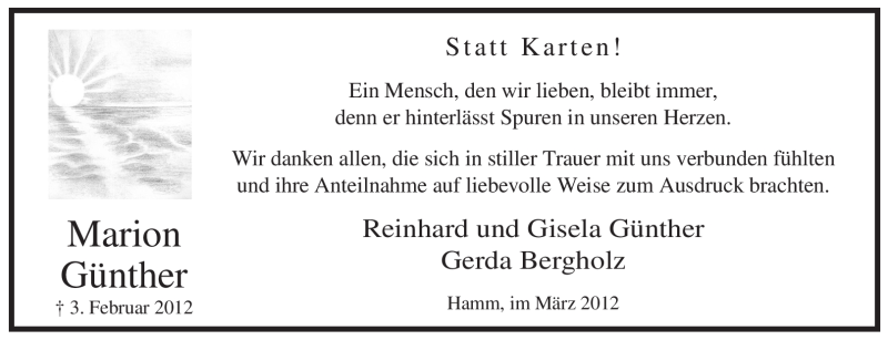 Hier finden Sie alle Traueranzeigen aus der Zeitung, die bisher für Marion Günther erschienen sind. Weitere Traueranzeigen, die in der Zeitung erscheinen, werden hier ebenfalls aufgelistet