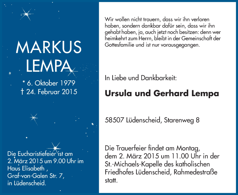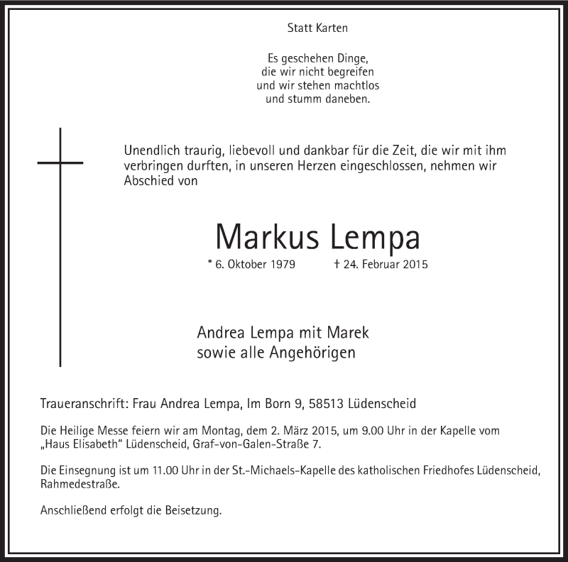 Hier finden Sie alle Traueranzeigen aus der Zeitung, die bisher für Markus Lempa erschienen sind. Weitere Traueranzeigen, die in der Zeitung erscheinen, werden hier ebenfalls aufgelistet