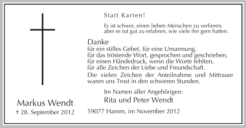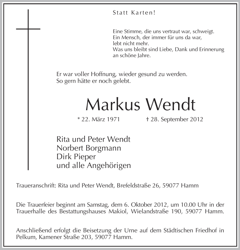 Hier finden Sie alle Traueranzeigen aus der Zeitung, die bisher für Markus Wendt erschienen sind. Weitere Traueranzeigen, die in der Zeitung erscheinen, werden hier ebenfalls aufgelistet