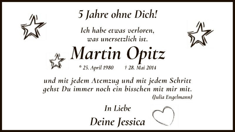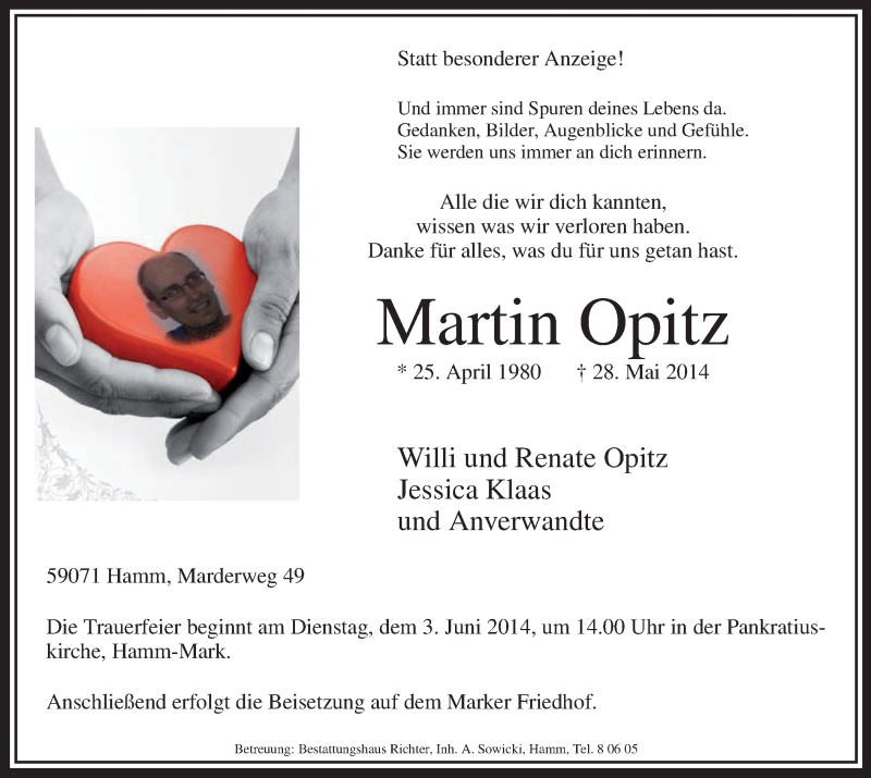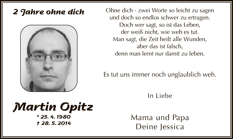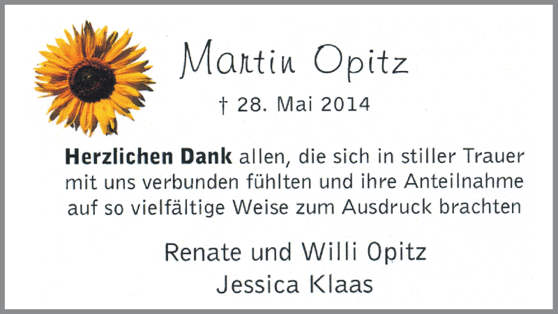 Hier finden Sie alle Traueranzeigen aus der Zeitung, die bisher für Martin Opitz erschienen sind. Weitere Traueranzeigen, die in der Zeitung erscheinen, werden hier ebenfalls aufgelistet